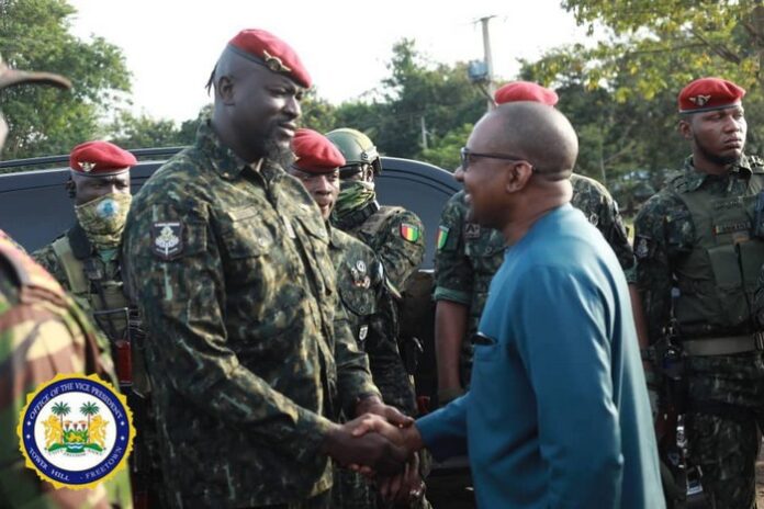 Sur son compte Meta, le vice-président Juldeh Jalloh déclare. « Je viens d’accueillir le chef militaire guinéen le colonel Mamadi Doumbuya en Sierra Leone à la frontière de Kambia. Il est ici pour une visite de travail d’une journée avec Son Excellence le Président Julius Maada Bio. Cette visite renforcera les liens socio-économiques, culturels et politiques solides entre le peuple de la Sierra Leone et de la Guinée ».