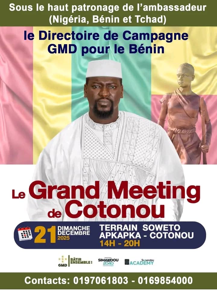 Cette initiative est portée par Monsieur Camara Aboubacar,Directeur Adjoint du Directoire de campagne du mouvement Génération pour la Modernité et le Développement (GMD) Bénin et Nigeria . L’événement a pour objectif de rassembler les militants et sympathisants afin de réaffirmer leur engagement et leur soutien au projet politique du GMD.