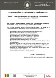 Home SOCIÉTÉ Présidence de la République: le Président Mamadi Doumbouya est attendu à... SOCIÉTÉ Présidence de la République: le Président Mamadi Doumbouya est attendu à Conakry ce vendredi By Directeur Publication - 5 mars 2026 53923 0 Facebook Twitter Pinterest WhatsApp L’annonce est faite à travers un communiqué publié sur les ondes de la RTG. Pour l’occasion, la Présidence de la République informe le peuple de Guinée du retour du Président Mamadi Doumbouya à Conakry le vendredi 06 mars à 10h. RELATED ARTICLESMORE FROM AUTHOR Guinée : la vulgarisation du nouveau Code de l’eau au cœur d’un atelier national Décès de Mamadou Sylla à Conakry, Cellou Dalein Diallo lui rend son dernier hommage Guinée : la révision du code des investissements lancée à Conakry